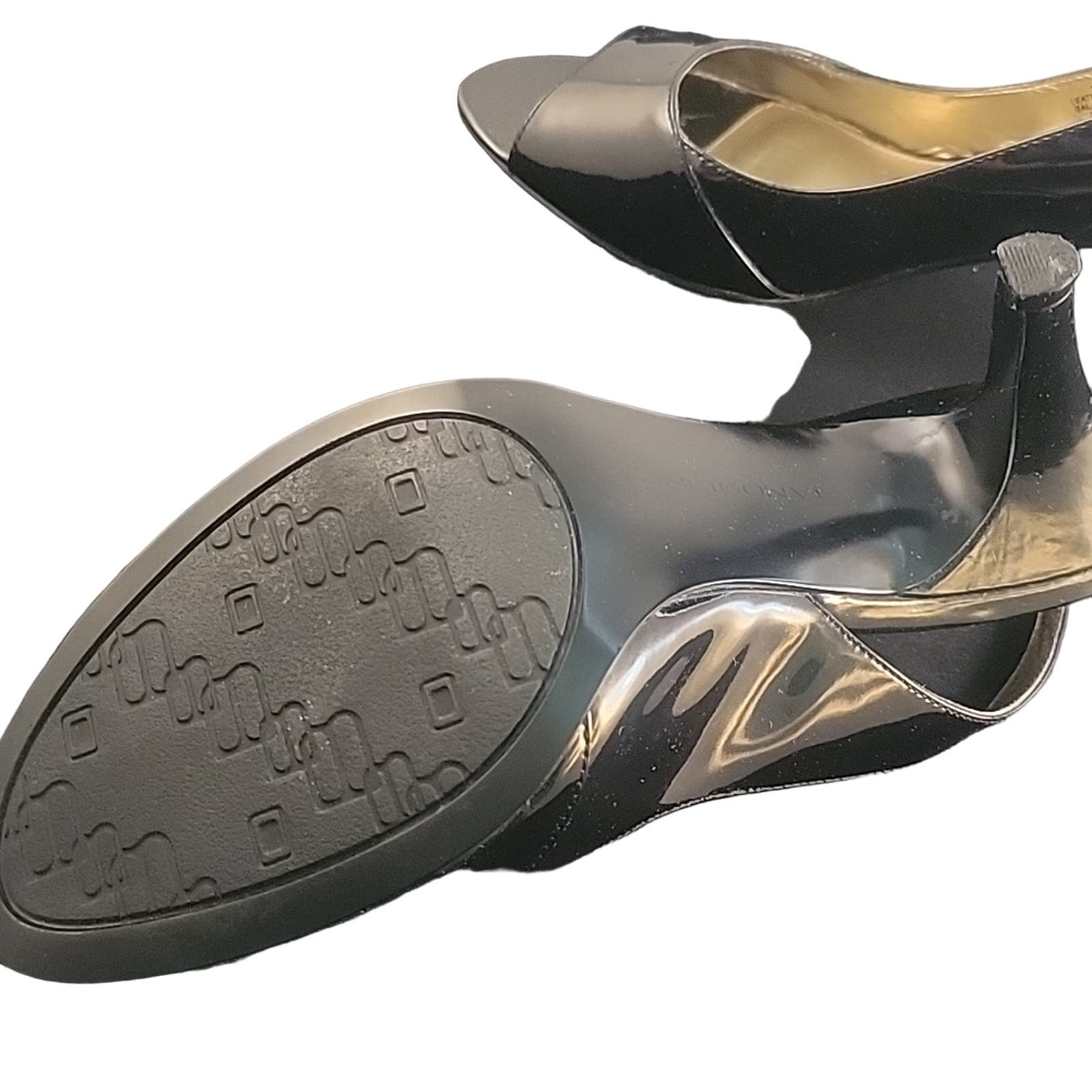 Bandolino open toe, sling back, pattent leather upper high heel, slight wear great condition, sz 8.5